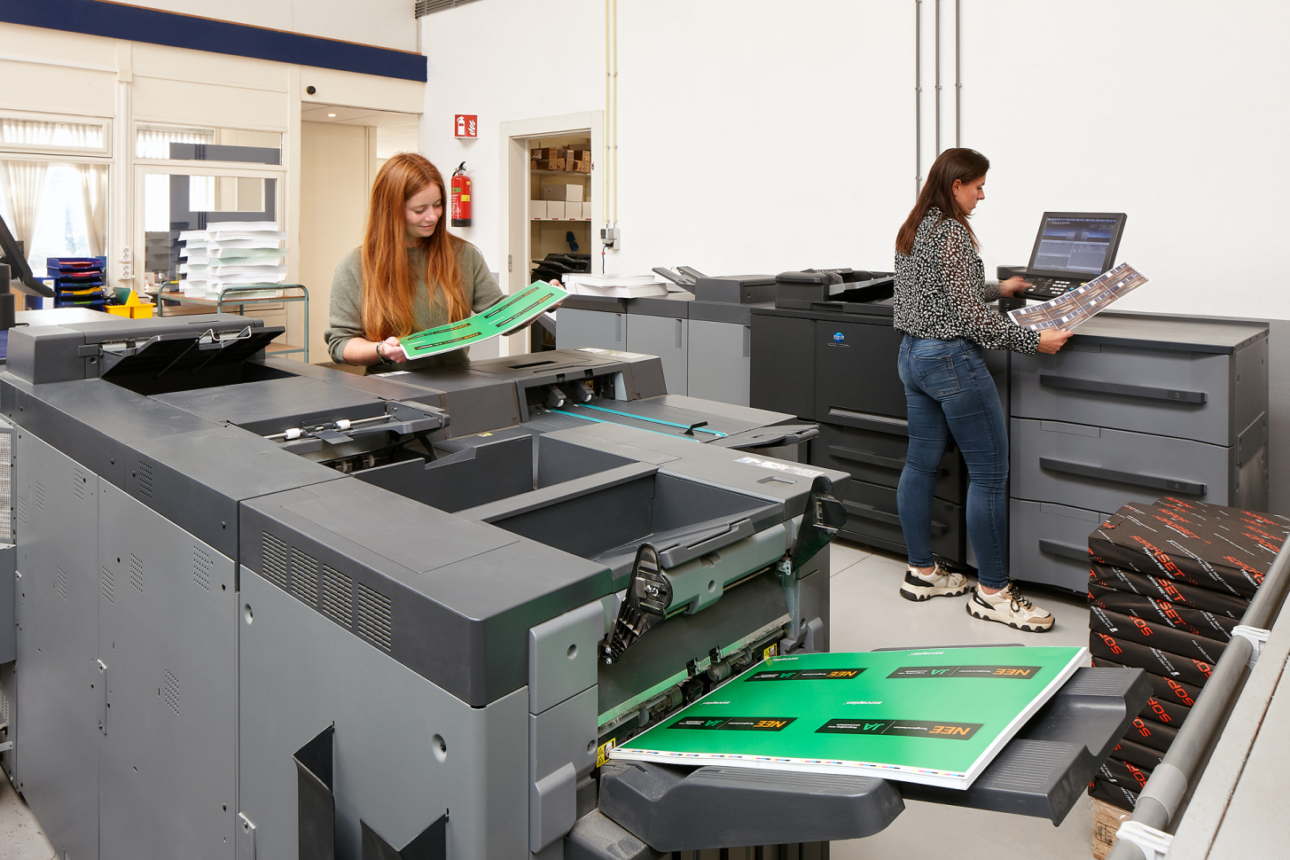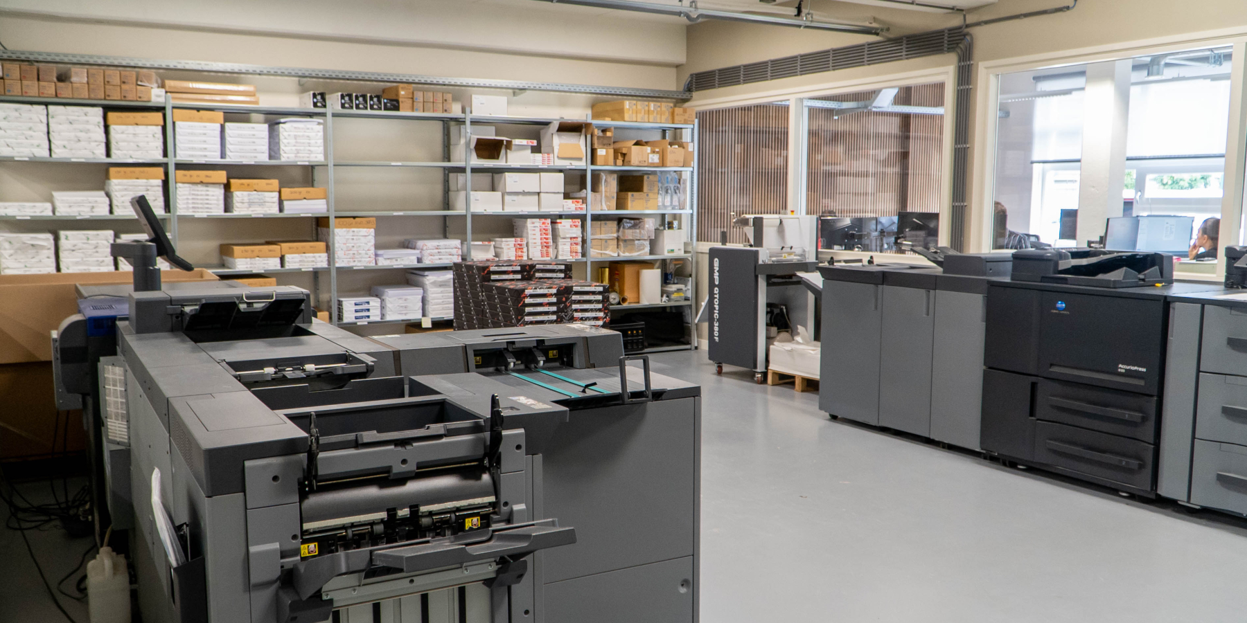 Eén van de machines is uitgerust met een uitgebreide afwerkeenheid waarmee we kunnen verzamelen, rillen, vouwen, trimmen en nieten. Hierdoor kunnen wij naast flyers, posters, kaarten en uitnodigingen ook complete brochures in-huis produceren. Dankzij de speciale enveloppenunit is het bovendien mogelijk om C4- en C5-enveloppen full-color te bedrukken.